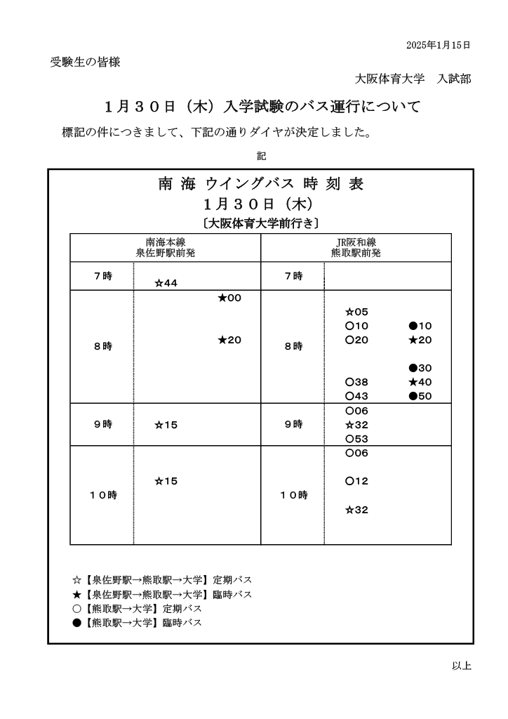 2025.01.15 2025年度 一般選抜?スポーツ特別総合型選抜(第3回)実施日のバス運行について 2025年1月30日(木)?31日(金)入学試験当日のバスダイヤが決定しましたのでお知らせします。 試験場へは、公共交通機関をご利用のうえお越しください。 また、受験者以外は大学へ入構ができませんので、予めご了承ください。
