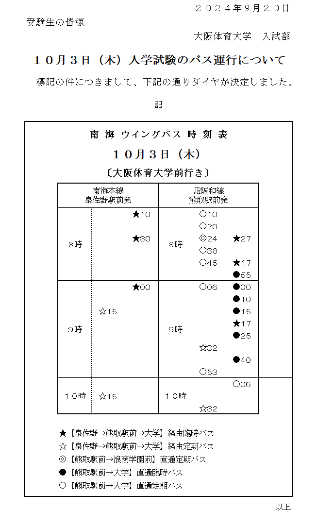 2024.09.20 2025年度 総合型選抜?卒業生子女型選抜?特別総合型選抜 実施日のバス運行について 2024年10月3日(木)入学試験当日のバスダイヤが決定しましたのでお知らせします。 試験場へは、公共交通機関をご利用のうえお越しください。 また、受験者以外は大学へ入構ができませんので、予めご了承ください。